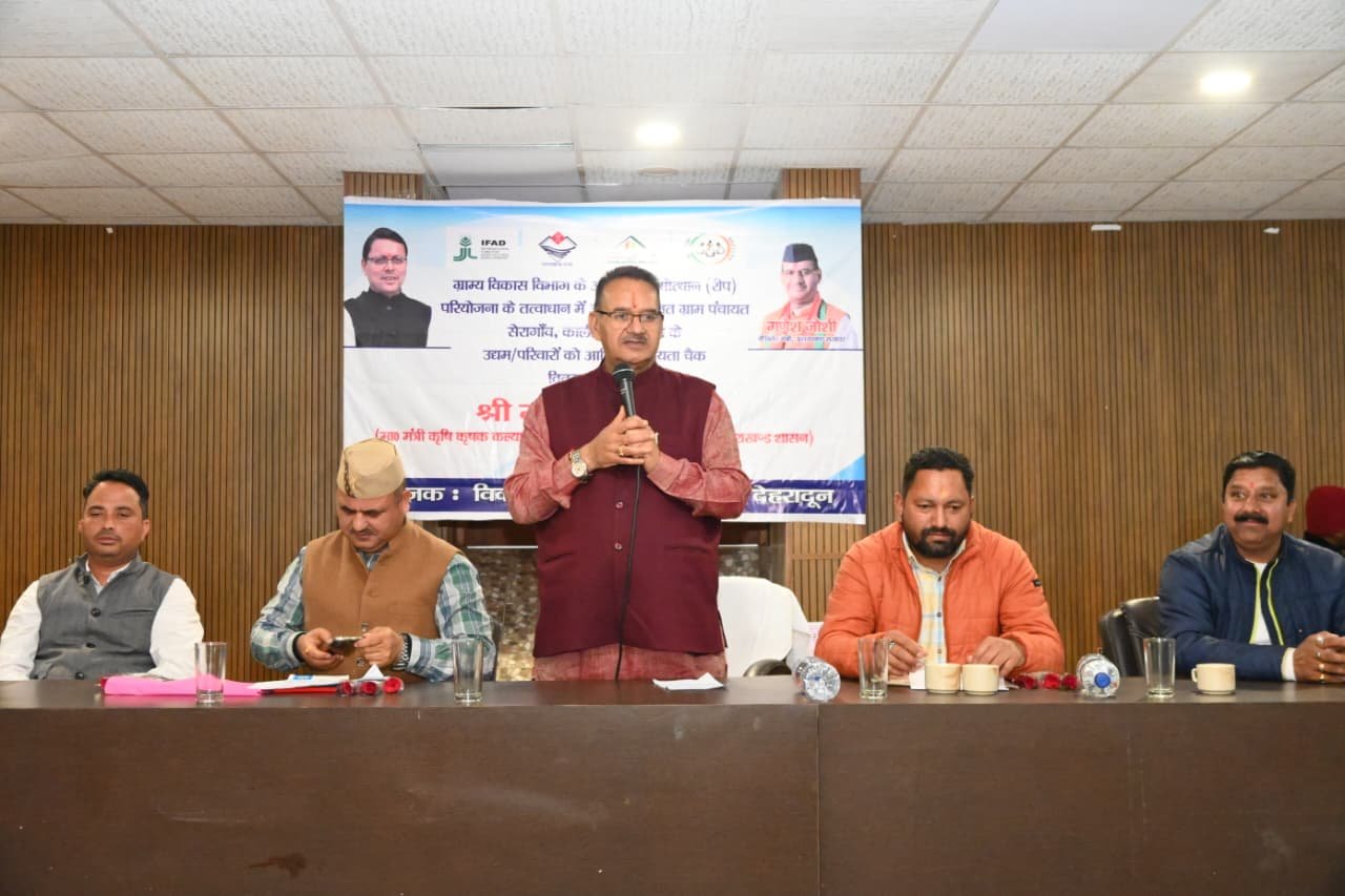 देहरादून, 20 मार्च। कैबिनेट मंत्री गणेश जोशी ने आज सहस्त्रधारा स्थित एक निजी होटल में ग्राम्य विकास विभाग के अंतर्गत संचालित ग्रामोत्थान (रिप) परियोजना के तहत विकास खण्ड रायपुर के आपदा प्रभावित ग्राम पंचायत सेरागांव, कार्लीगाड़ और धनौला के 110 परिवारों को बड़ी राहत प्रदान की। इस दौरान उन्होंने विभिन्न स्वयं सहायता समूहों को ₹87 लाख से अधिक की सहायता राशि के चैक वितरित किए