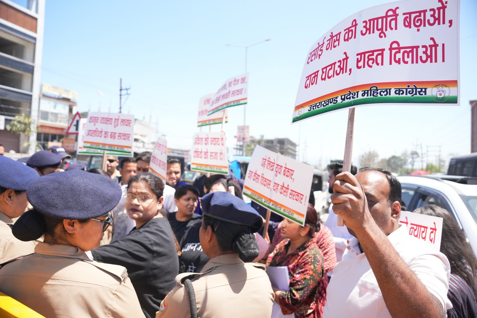 देहरादून। उत्तराखंड प्रदेश महिला कांग्रेस की प्रदेश अध्यक्ष ज्योति रौतेला के नेतृत्व में प्रधानमंत्री नरेंद्र मोदी के नाम ज्ञापन सौंपने जा रहे महिला कांग्रेस कार्यकर्ताओं को पुलिस प्रशासन ने कारगी आईएसबीटी रोड स्थित मध्य ब्राह्मणवाला चौक पर बैरिकेडिंग कर रोक दिया।